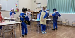 SS.OS エプロンや三角巾を鏡を見ながら自分で身支度を整えたり、友達同士で困っている所を協力しあいながら行う姿が見られました(o^^o)